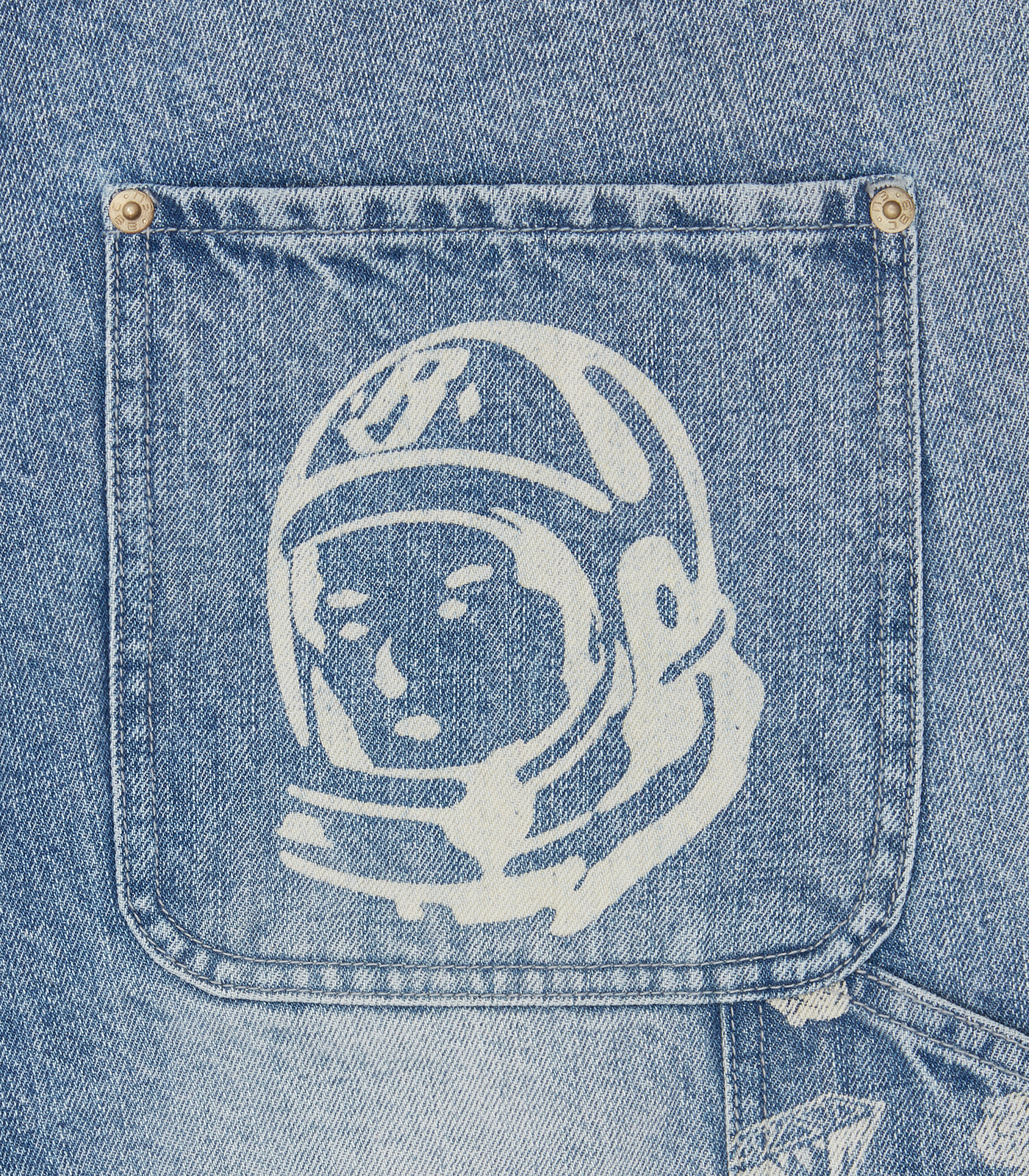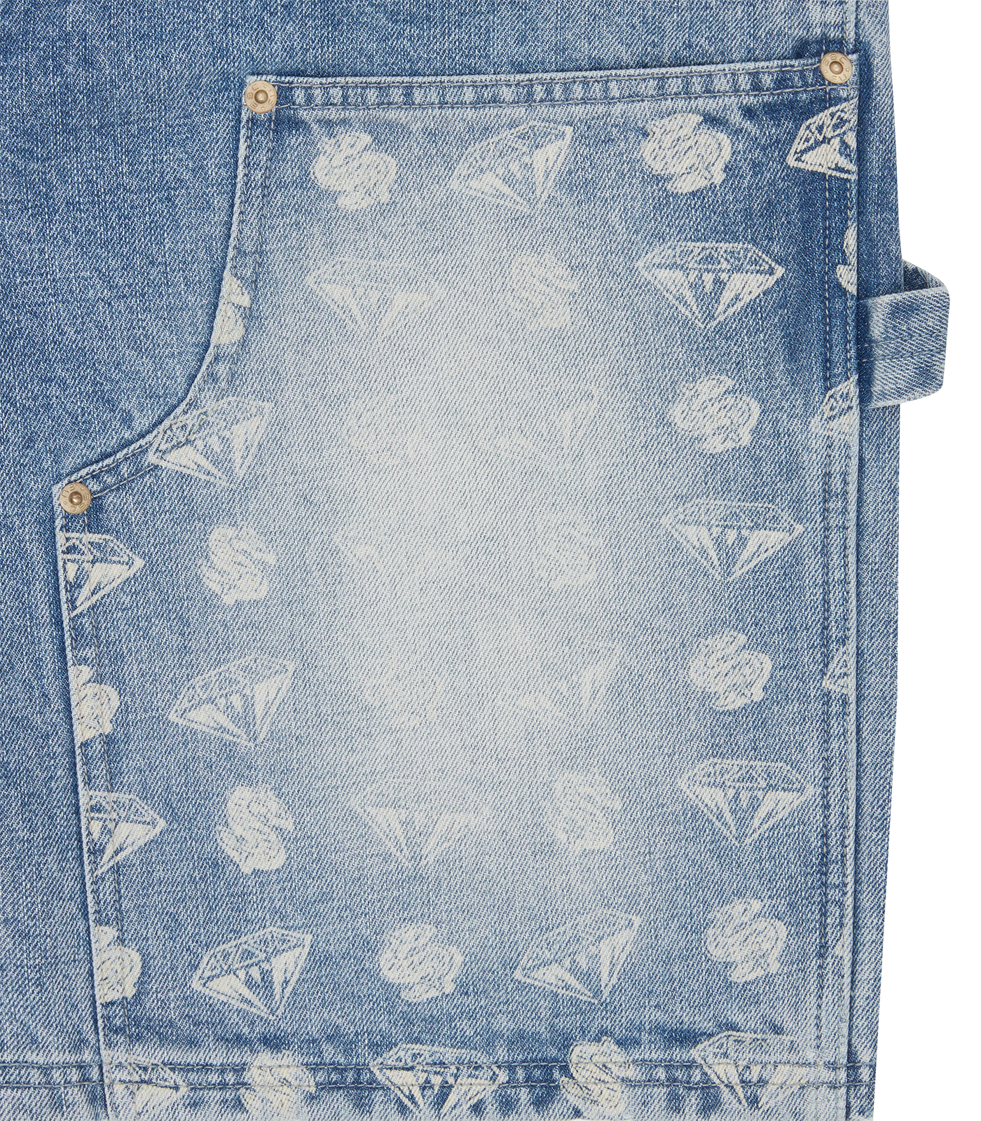 Billionaire Boys Club Fall '25 - Diamonds & Dollars Denim Carpenter Shorts in light wash blue present an all-over Diamonds & Dollar print pattern on the front leg panels and the Astro helmet on back pockets.